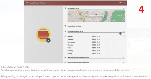 - Pertama : Cara tetapan pada Profile. Pada bahagian ini anda perlu tetapkan lokasi bisnes, jenis bisnes, pengenalan bisnes, waktu operasi bisnes, email dan website. Paling penting di bahagian ini adalah pada waktu operasi, Away Message akan dihantar kepada prospek yang whatsap di luar waktu operasi anda.