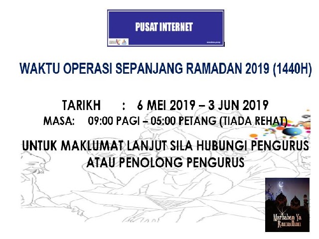 6 May 2019 | Aktiviti TerkiniBerikut adalah Notis Waktu Operasi Pusat Ekonomi Digital Teluk Rimba pada bulan Ramadhan bermula 6 Mei - 3 Jun 2019