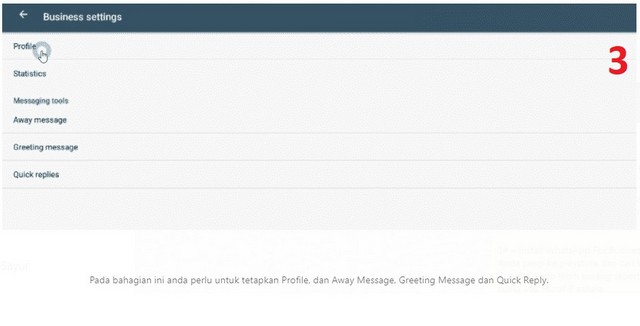 - Pertama : Cara tetapan pada Profile. Pada bahagian ini anda perlu tetapkan lokasi bisnes, jenis bisnes, pengenalan bisnes, waktu operasi bisnes, email dan website. Paling penting di bahagian ini adalah pada waktu operasi, Away Message akan dihantar kepada prospek yang whatsap di luar waktu operasi anda.