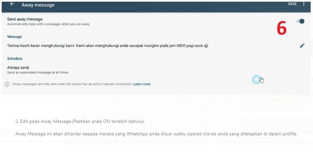 - Ketiga : Edit pada Away Message.(Pastikan anda ON terlebih dahulu). Away Message ini akan dihantar kepada mereka yang WhatsApp anda diluar waktu operasi bisnes anda yang ditetapkan di dalam profile.