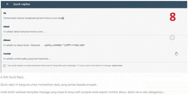 - Kelima : Edit Quick Reply. Quick reply ini berguna untuk memastikan reply yang pantas kepada prospek. Anda boleh sediakan template message yang biasa di tanya oleh prospek anda seperti nombor akaun, detail servis dan sebagainya. Apabila anda nak reply kemudian, anda hanya perlu taip “/” sahaja dan satu drop down untuk kesemua quick reply yang telah ditetapkan akan muncul.