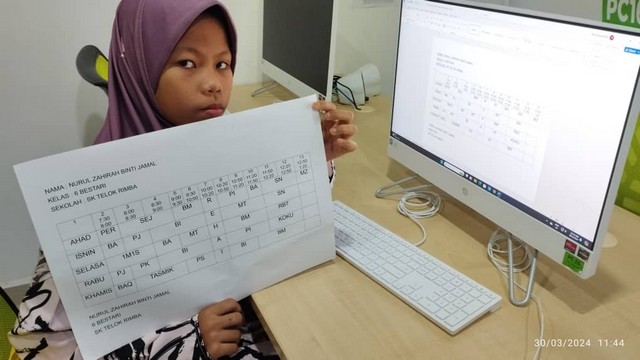 31 Mac 2024 | Aktiviti TerkiniNADI Telok Rimba telah mengadakan kelas bersama peserta di bawah umur 15 tahun dan bersama-sama membuat jadual kelas pelajar dengan menggunakan MS Word. Pelajar menyalin jadual kelas mereka yang telah dibawa terlebih dahulu sebelum dicetak.