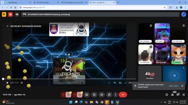 Dalam bengkel unboxing Kit Tiny Techies, pelajar akan mempelajari Pengenalan kit robotic, tunjuk cara penggunaan komponen seperti Microbit Box dan Kabel USB, Serta Penerangan alat alat seperti sensor dan cara menggunakannya dalam aktiviti membuat robot.
