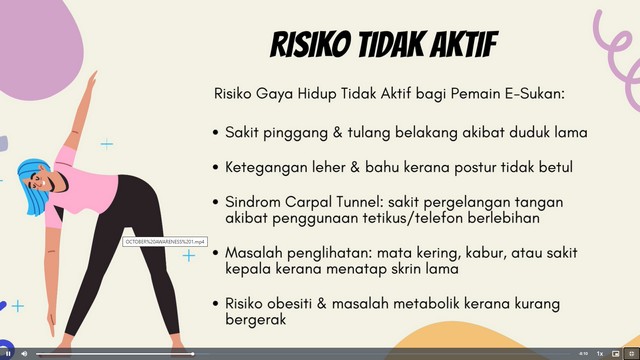 6 Oktober 2025 | Aktiviti Terkinifizikal dan pemulihan" ialah sebuah program kesedaran yang bertujuan untuk mendidik pemain e-sukan tentang kepentingan menjaga kesihatan fizikal dan pemulihan. Program ini memberi tumpuan kepada menjaga tubuh badan pemain walaupun dalam aktiviti yang kurang pergerakan, membantu mencegah masalah otot dan sendi, dan meningkatkan prestasi atlet dalam e-sukan melalui pemahaman sains sukan.
