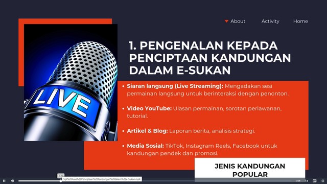 9 September 2025 | Aktiviti TerkiniAssalamualaikum WBT dan Selamat Sejahtera. Sekitar Laporan NADI E-Sukan kepada peserta E-Sukan NADI Teluk Rimba untuk kelas kesedaran bertajuk Pecutan NADI Merdeka Modul 2 : Asas PENCIPTAAN KANDUNGAN DALAM E-SUKAN