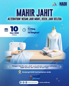 Program Mahir Jahit kali ini memberi tumpuan kepada teknik alteration pakaian – bagaimana menyesuaikan saiz agar lebih muat dan selesa dipakai. Peserta akan diajar cara asas mengecilkan atau membesarkan pakaian dengan kemas, termasuk teknik jahitan mudah, penggunaan alat jahit yang betul, serta tip praktikal untuk mengekalkan bentuk asal pakaian. Sesi ini sesuai untuk mereka yang ingin menjimatkan kos, menghidupkan semula pakaian lama, atau menambah kemahiran jahitan untuk kegunaan harian.