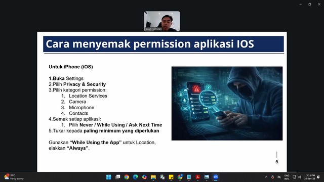 22 Januari 2026 | Aktiviti TerkiniSesi ini memberi pendedahan tentang amalan cyber hygiene iaitu langkah asas menjaga keselamatan diri dalam dunia digital. Peserta belajar cara melindungi kata laluan, mengelakkan pautan mencurigakan, mengemas kini perisian, dan menjaga privasi atas talian.