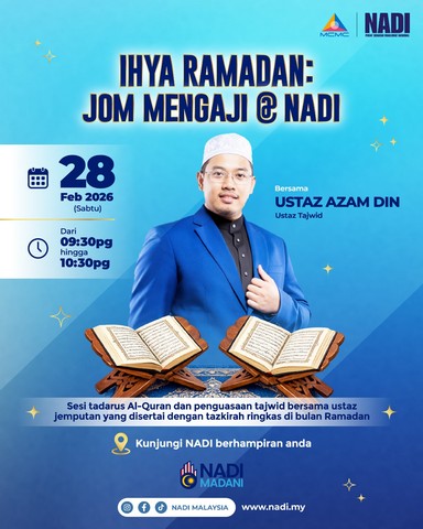Sempena bulan Ramadan yang penuh keberkatan, NADI menjemput komuniti untuk bersama-sama menghidupkan suasana ibadah melalui program Jom Mengaji bersama Ustaz Azam Din. Sesi ini bertujuan menggalakkan masyarakat mendekatkan diri dengan al-Quran, memahami keindahan ayat-ayat suci, serta menghayati nilai spiritual Ramadan. Program ini bukan sahaja memberi peluang untuk membaca al-Quran secara berjemaah, tetapi juga memperkukuh ukhuwah dan semangat kebersamaan.