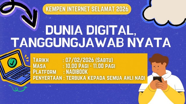 7 Februari 2026 | Aktiviti TerkiniPada 7 Februari 2026, satu webinar bertajuk “Kempen Internet Selamat: Dunia Digital Tanggungjawab Nyata” telah diadakan dari pukul 10.00 pagi hingga 11.00 pagi. Program ini bertujuan meningkatkan kesedaran masyarakat tentang tanggungjawab dalam penggunaan dunia digital secara selamat dan beretika.