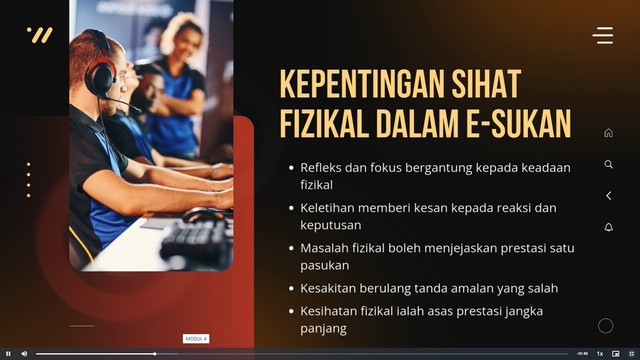Melalui ceramah, bengkel ergonomik, serta aktiviti senaman ringan, para peserta didedahkan kepada amalan gaya hidup sihat yang dapat mengurangkan risiko masalah fizikal akibat masa bermain yang panjang. Usaha ini sekaligus memperkukuh kesedaran bahawa kecergasan tubuh adalah asas kepada kejayaan dalam arena e-sukan.